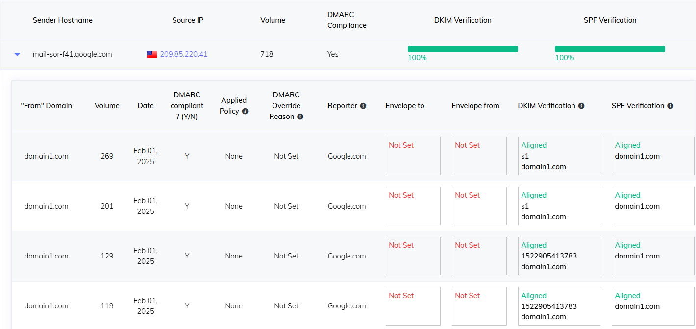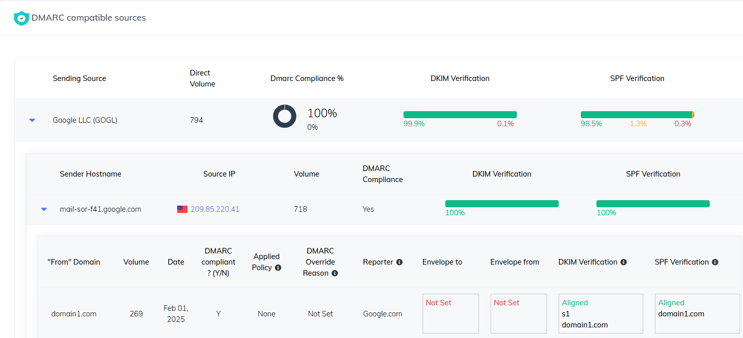 In this example, the sending source is Google and the “From” Domain is domain1.com. This means that emails were sent from Google’s mail servers on behalf of the domain domain1.com . Since those emails are SPF and DKIM aligned, they are DMARC complaint and are therefore presented in the DMARC compatible sources section.