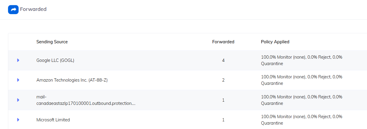 In this example, the sending source is Google and the volume of emails forwarded from this domain is 1.Although the forwarded email was found not to be DMARC compliant due itand failed DKIM authentication, and SPF alignment, the receiver was able to identify it as a forwarded email and therefore a policy of none was applied. You can read more about Forwarding within DMARC
