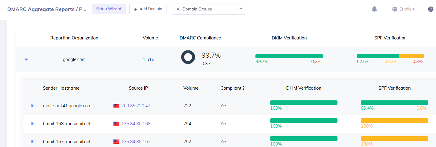Each row can be further cascaded to reveal sender hostnames and IP addresses of email sources, volume, status of DMARC compliance and SPF and DKIM verification results.