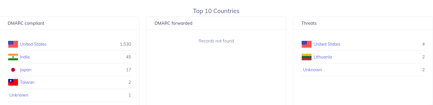 The section at the bottom of the page provides a list of countries (example US, Japan, Taiwan) and their successive volume of DMARC complaint emails that were sent from sending sources originating from these locations on behalf of your registered emails domains. It also provides insights on the Top 10 countries for which emails failed DMARC and threats were detected.