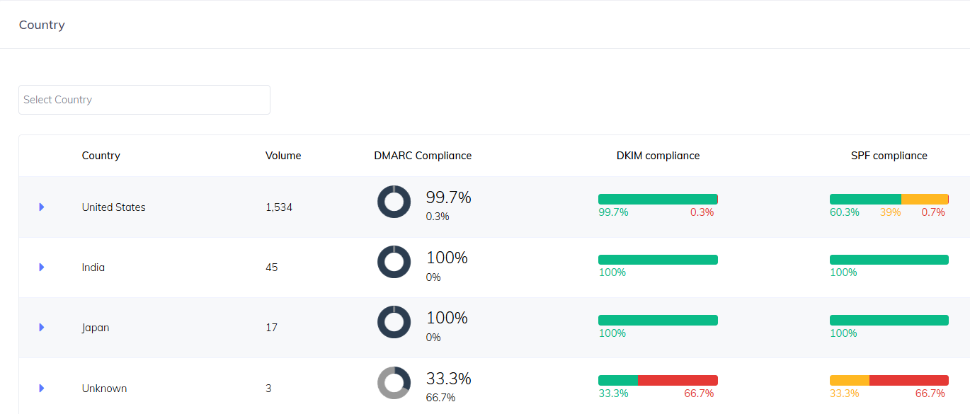 You can use this page when you want to view DMARC aggregate reports with enhanced visibility into the country of origin of your sending sources, that are sending emails on behalf of your domain, alongside relevant information on the sender hostname, IP address and percentage of emails that are DKIM/SPF compliant.