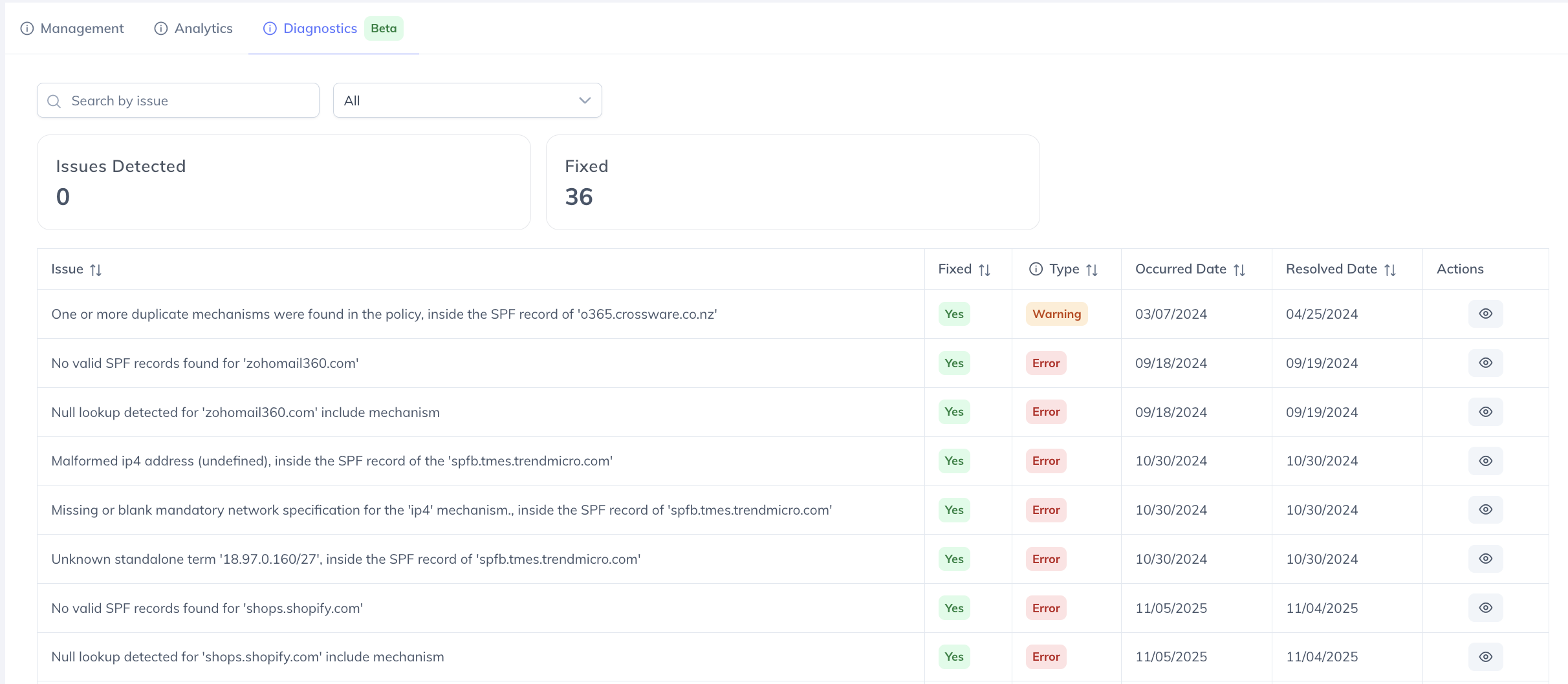 The SPF Diagnostics tab displays issues detected for a domain in its SPF record, along with detailed recommendations for solving each issue. Enabling PowerSPF itself is a solution to the majority of SPF-related issues!