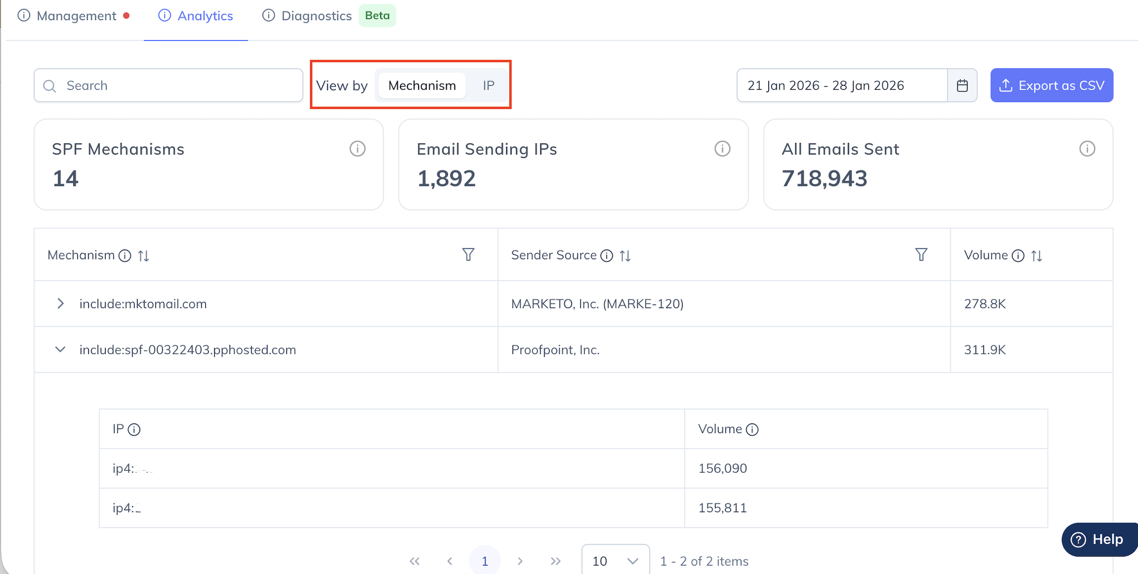 Mechanism view provides a grouped, high-level perspective based on SPF mechanisms such as include, ip4, and ip6, helping you understand which authorized services or sources are responsible for sending emails on behalf of your domain and how much volume each contributes. It also allows you to expand each sending service to view the underlying IPs associated with it, offering additional visibility into the nested IP sources behind each mechanism.