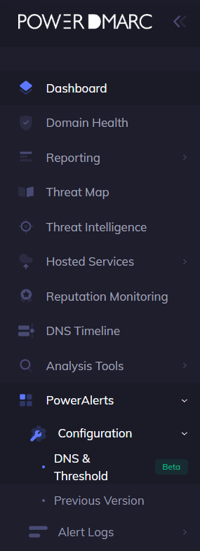 Navigate to PowerAlerts> Configuration> DNS & Threshold(Beta) in your PowerDMARC dashboard.