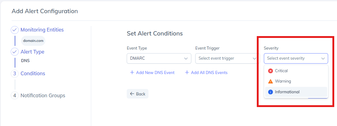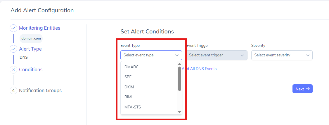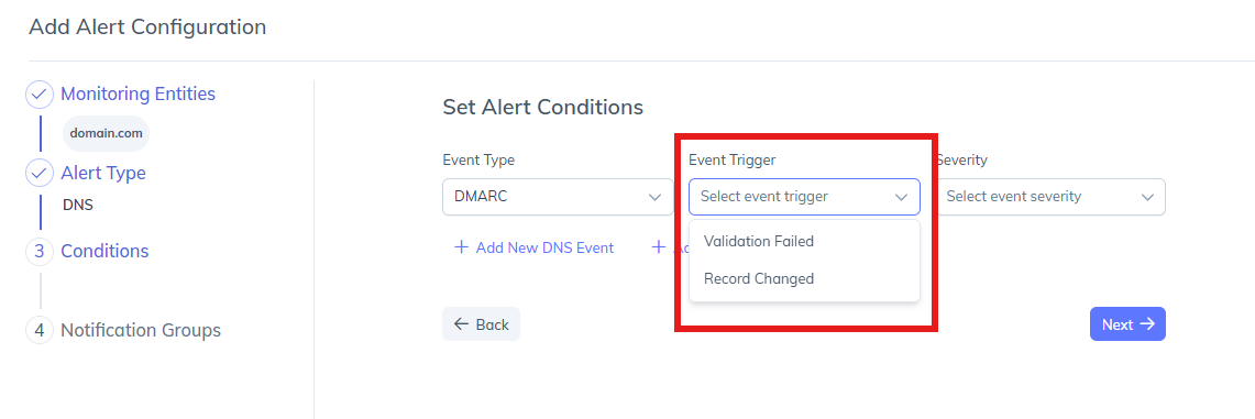 Select one event type (e.g., DMARC) and configure conditions only for that event.Add New DNS Event