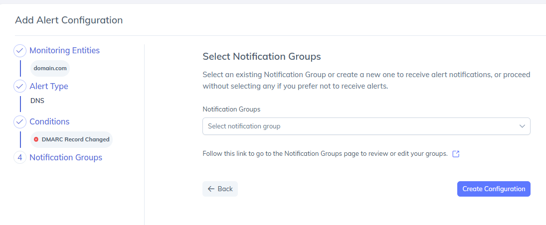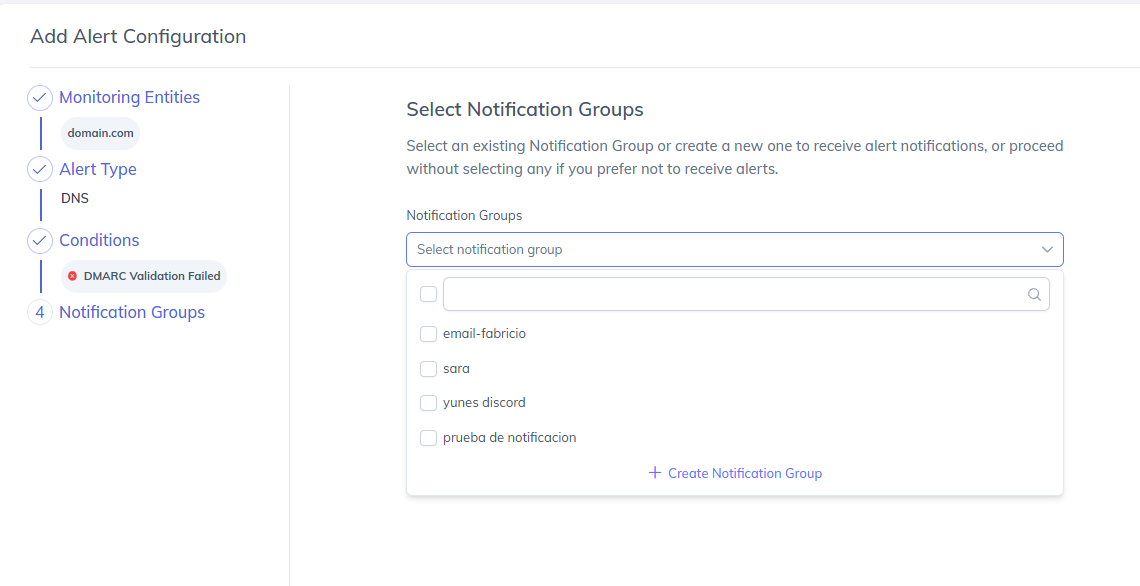 Notification Groups define who receives alert notifications and how they are delivered. PowerDMARC allows you to either select an existing notification group or create a new one during alert configuration.