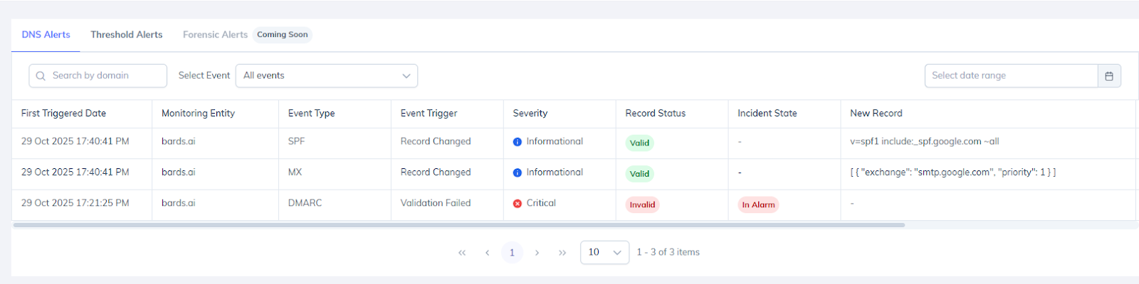 DNS alerts focus on changes or issues related to DNS records such as DMARC, SPF, DKIM, BIMI, MTA-STS, TLS-RPT, A, MX and NS.