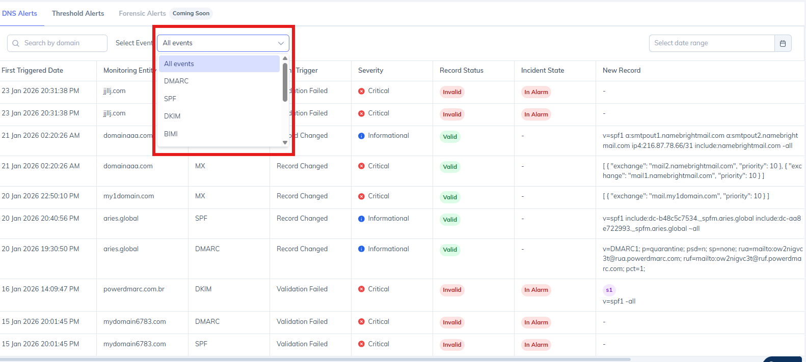 Use Add New DNS Event to include additional event types (e.g., SPF + DKIM) within the same alert configuration.Add All DNS Events