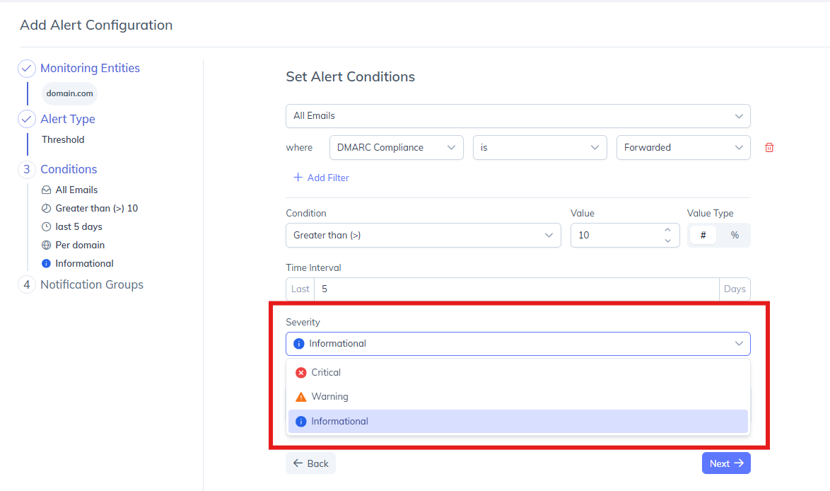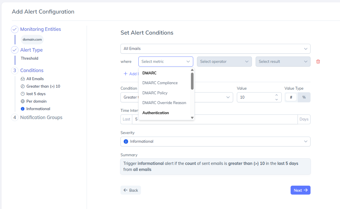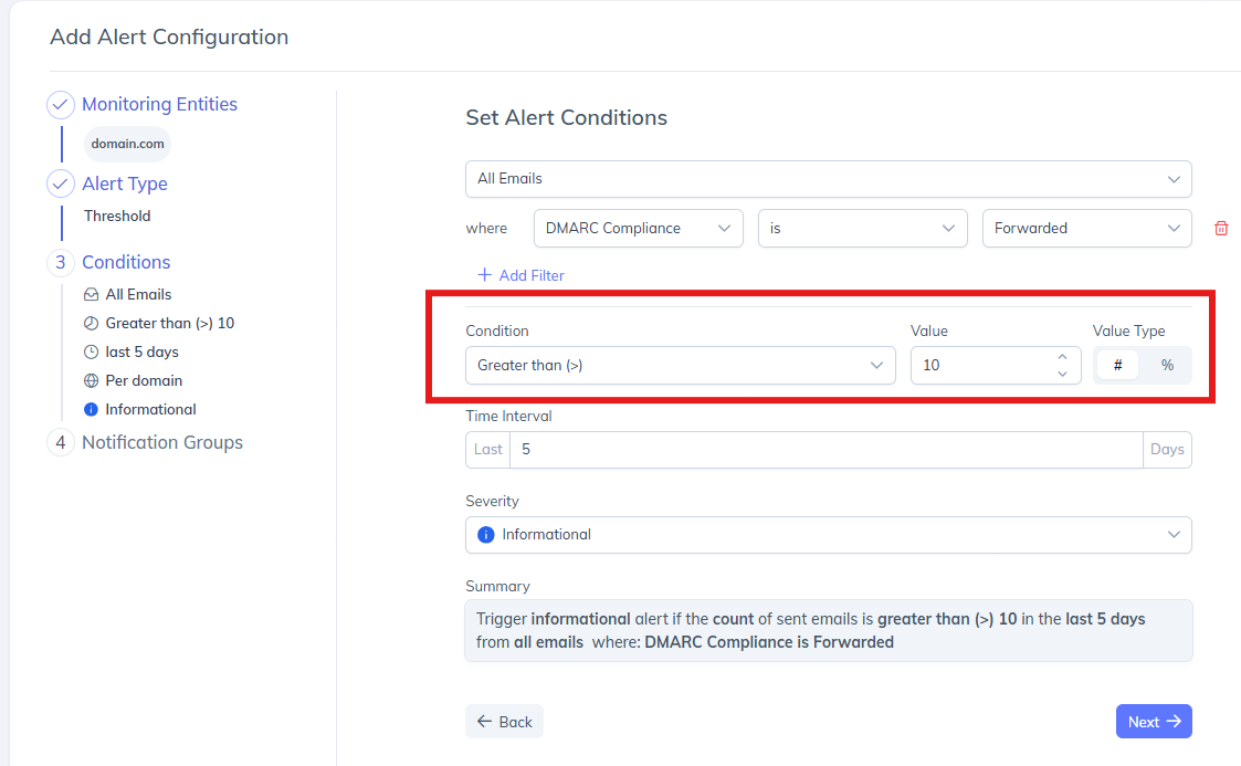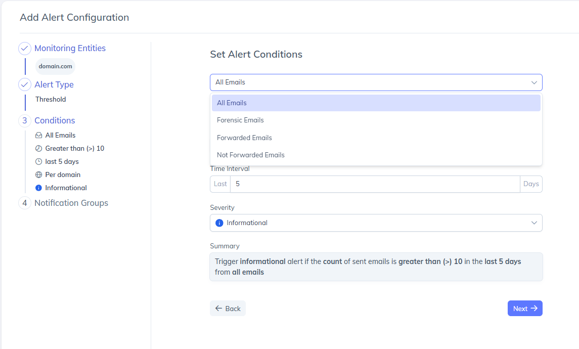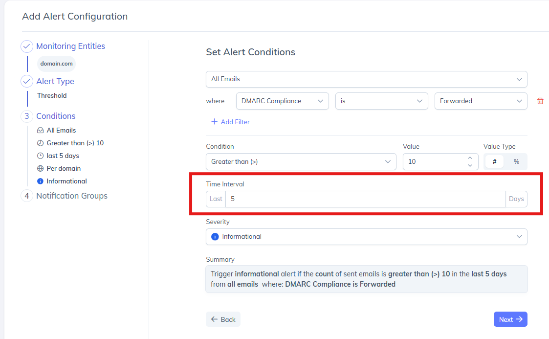 This means PowerDMARC continuously evaluates email activity over the last five days and triggers an alert if the threshold is exceeded within that period.