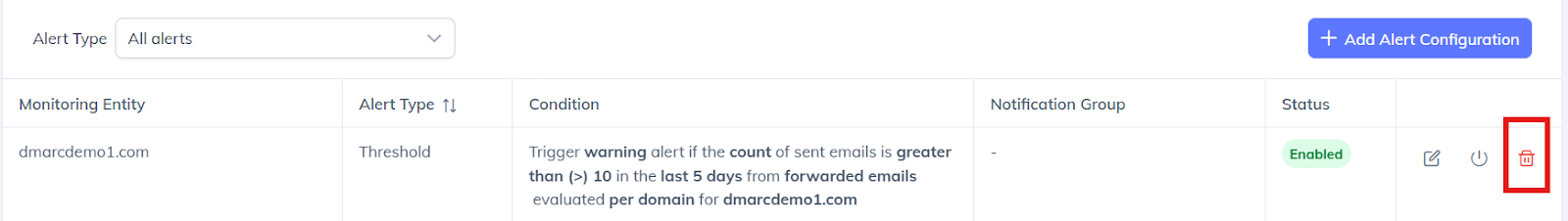 You can delete your Threshold Alert with a single click by clicking on the delete icon under Actions.