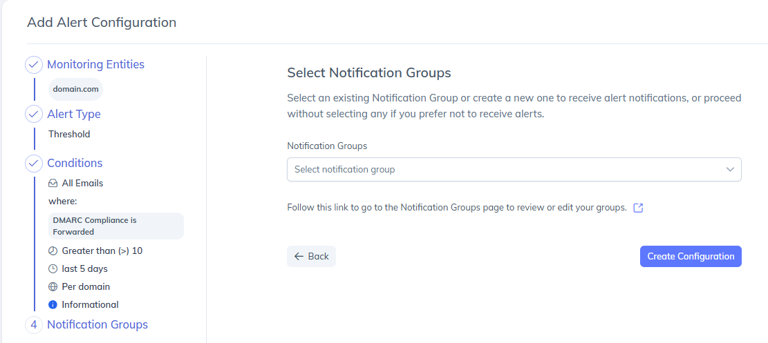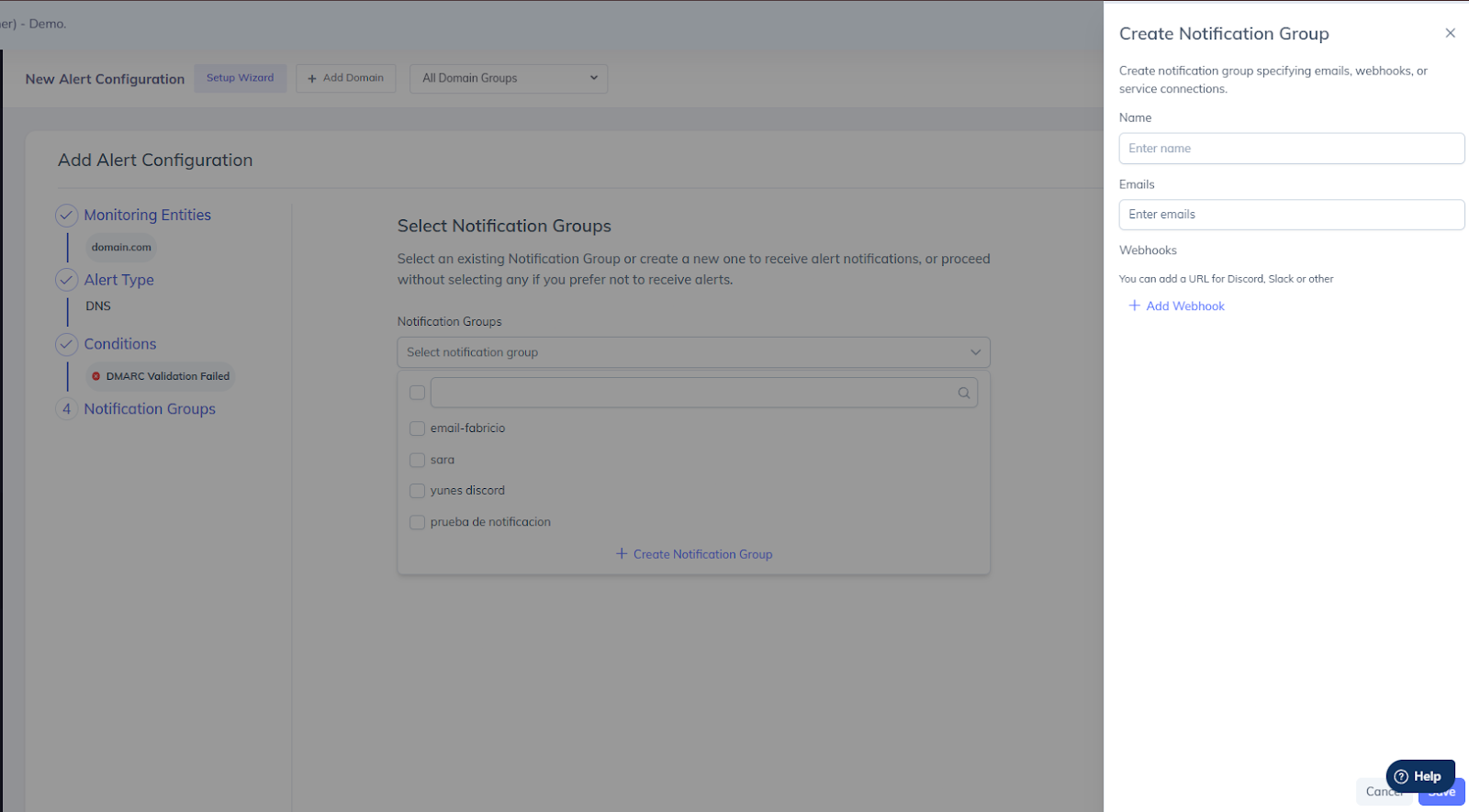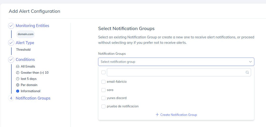 Notification Groups define who receives alert notifications and how they are delivered. PowerDMARC allows you to either select an existing notification group or create a new one during alert configuration.