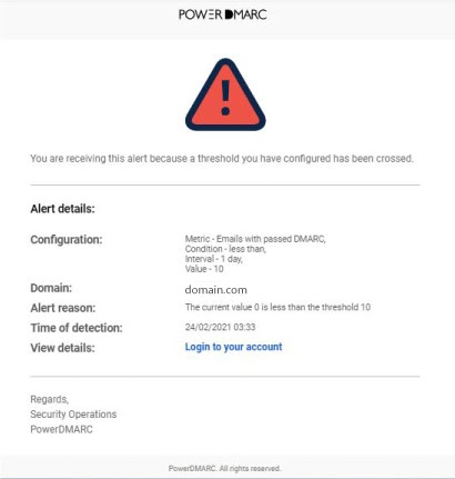 Threshold Alerts in PowerDMARC allow you to monitor email activity and authentication metrics based on defined limits over a specific time period. These alerts are triggered when a configured threshold is exceeded, helping you proactively detect unusual spikes, compliance drops, or authentication-related anomalies.